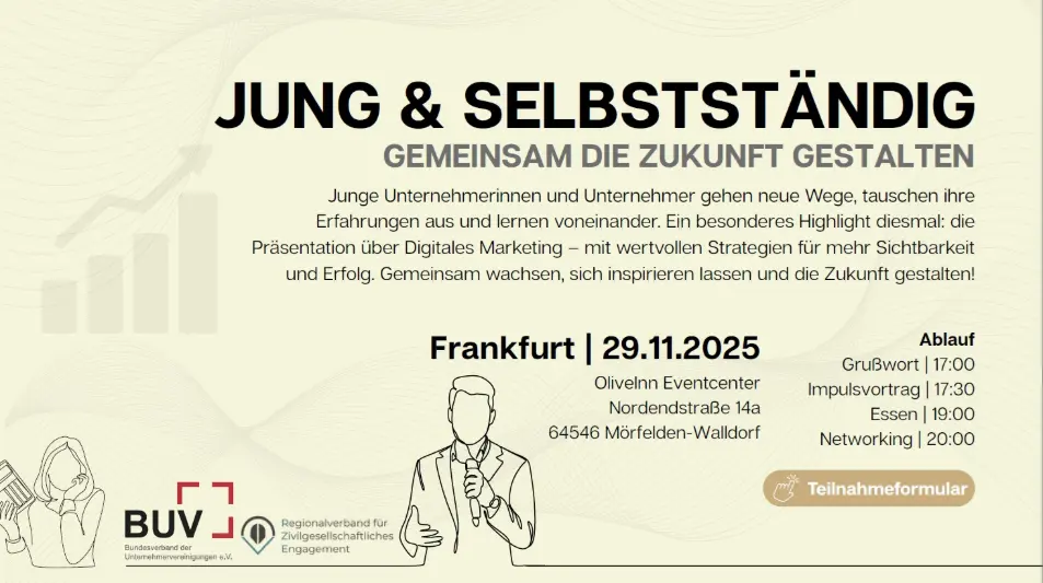 Am 29. November 2025 findet im OliveInn Eventcenter in Frankfurt das bundesweite Jungunternehmer-Event „Jung & Selbstständig“ statt.